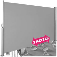 En savoir +Paravent, Brise Vue, Store Latéral Vertical Rétractable Balcon Jardin Terrasse Aluminium + Fixations TECTAKE. Ce magnifique paravent latéral rétractable offre une protection efficace contre les rayons du soleil (UV), le vent et préserve votre intimité et celle de vos convives. Idéal pour une utilisation sur la terrasse, le balcon ou dans le jardin. Grâce à l'enrouleur automatique, le paravent se déplie et se replie facilement et rapidement grâce au mécanisme avec ressort de tension intégré dans l'étui de fixation murale. Le tissu en polyester possède un revêtement hydrofuge résistant. Longueur ajustable, extensible jusqu'à 3 mètres. L'installation est effectuée en seulement quelques étapes. Il est cependant nécessaire de percer des trous dans le sol et le mur pour fixer convenablement le paravent. Les vis, chevilles et fixations murales sont compris dans la livraison.
