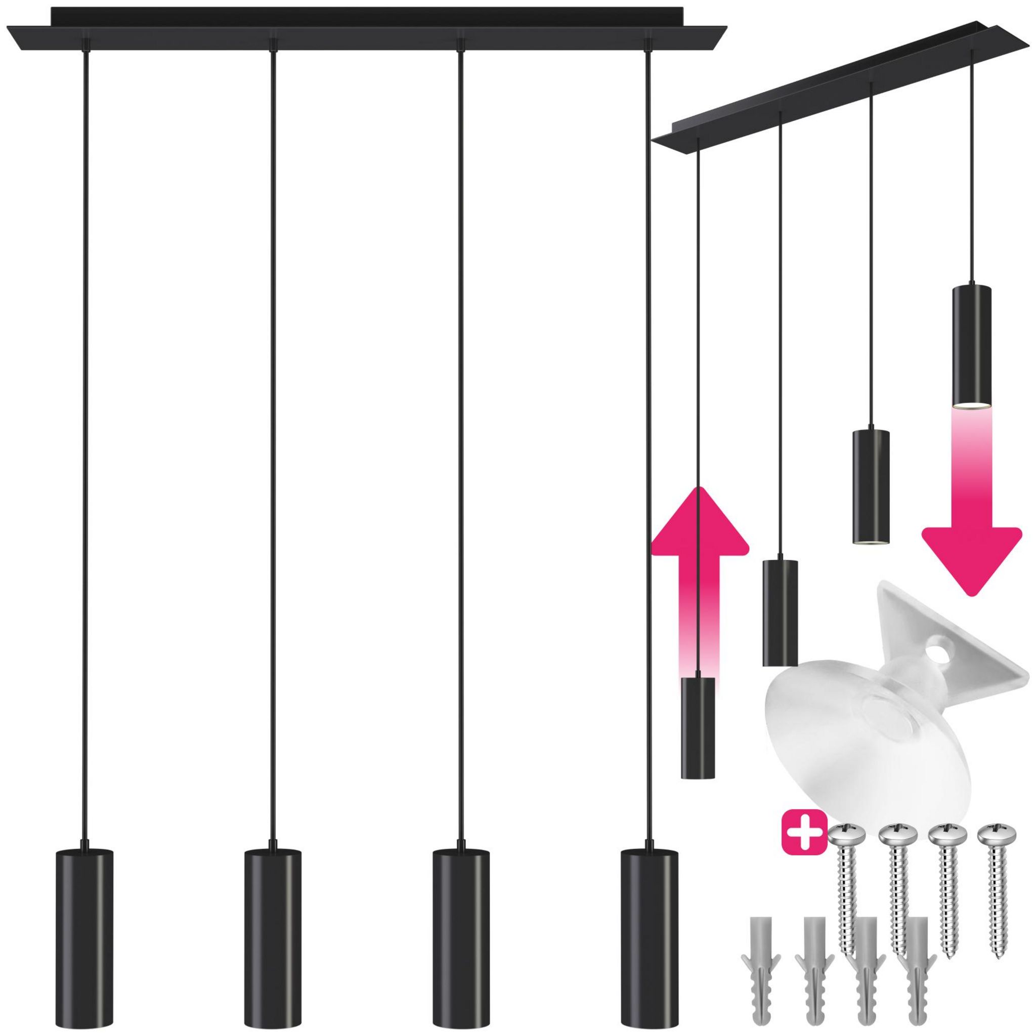 Grâce aux câbles réglables en longueur, la suspension convient non seulement à toutes les hauteurs de plafond, mais permet également un look personnalisé selon vos goûts. La source lumineuse moderne crée un éclairage uniforme et est particulièrement adaptée aux tables à manger longues ou aux comptoirs de cuisine.