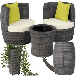 En savoir +Petit par la taille, grand par le confort : tel est notre salon de jardin Nice 2 places tectake ! Ce mobilier de jardin original trouve facilement sa place sur votre balcon ou votre terrasse. Il est du plus bel effet dans un jardin, patio ou encore sous une véranda pour une ambiance lounge branchée. Ce petit salon de jardin encastrable ne prend que très peu de place grâce à sa conception astucieuse : il prend la forme d'un tonneau une fois rangé. Cet ensemble de jardin est votre dose de détente facile à installer : il recèle une table et un élégant pot de fleurs. La structure des fauteuils, de la table et du bac à fleurs est en aluminium recouverte de résine tressée. Ce matériau d'apparence similaire à celle du rotin naturel est très facile d'entretien et résistant aux intempéries. La résine tressée étant légère, vous pouvez déplacer sièges et table très facilement. La housse des coussins d'assise au revêtement hydrofuge est amovible et passe à la machine à laver. Ne cherchez plus : notre salon de jardin Nice 2 personnes tectake est le mobilier de jardin qu'il vous faut pour vos tête-à-tête !