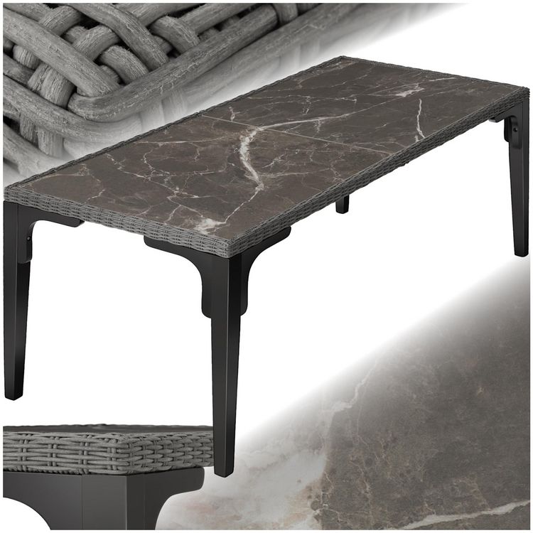 La grande table en rotin Foggia de tectake constitue une excellente base pour des heures de convivialité en plein air. Les deux plateaux massifs en grès cérame avec leurs marbrures attrayantes attirent l'attention. Le tressage de haute qualité et les pieds en bois robustes complètent avec succès l'a