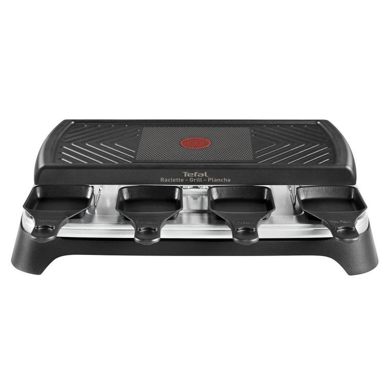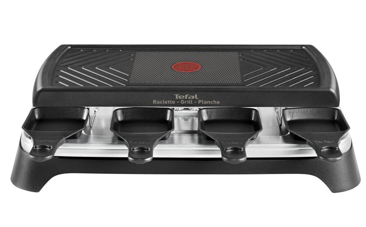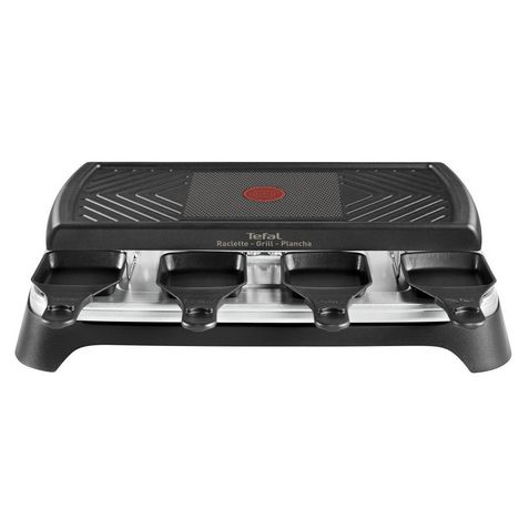 Tefal RE459812 Une raclette grill & plancha Tefal RE459812 idéale pour des moments de convivialité en famille ou entre amis !Apportez une touche tendance et design avec cette raclette à l'habillage Noir & Inox. La plaque bi-fonction, 1/2 grill et 1/2 plancha, vous permettra de choisir le bon mode de cuisson pour vos aliments !Indicateur ThermoSpot® : il vous indique lorsque la plaque est à la bonne température. La plaque et les 8 coupelles possèdent un revêtement antiadhésif qui apporte durabilité et résistance et qui est facile à nettoyer. Les manches des coupelles et la base de l'appareil son en thermoplastique pour une plus grande sécurité.