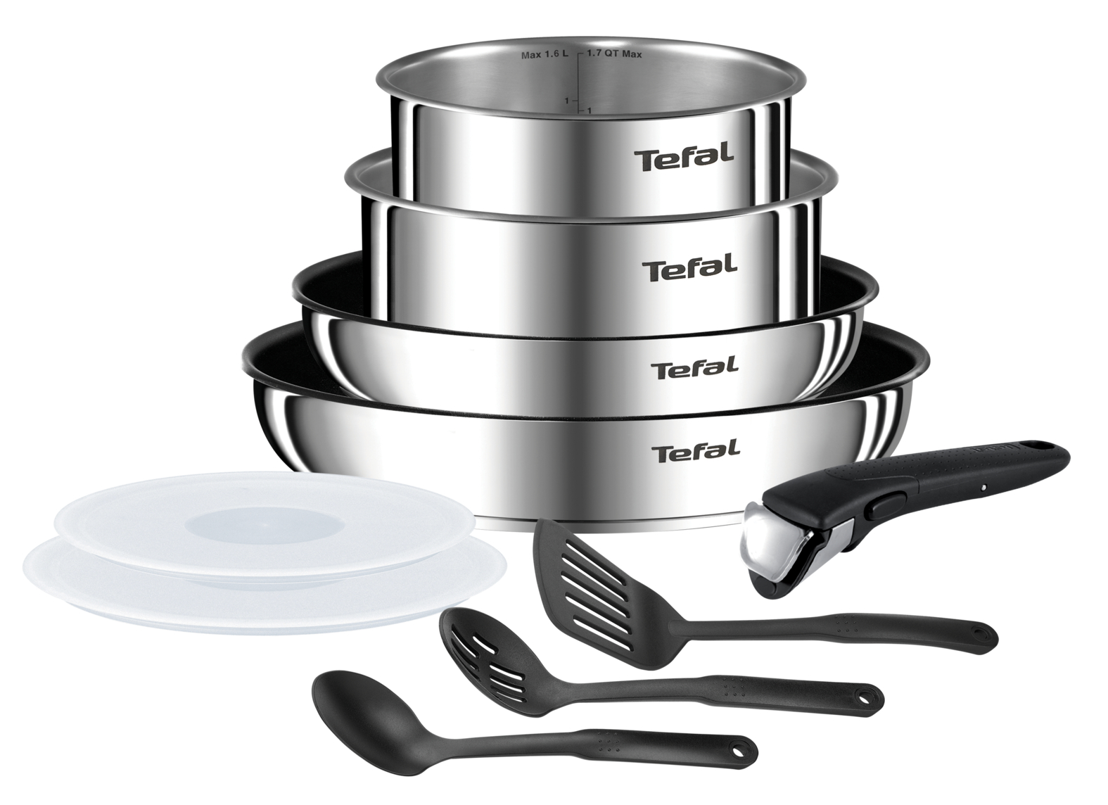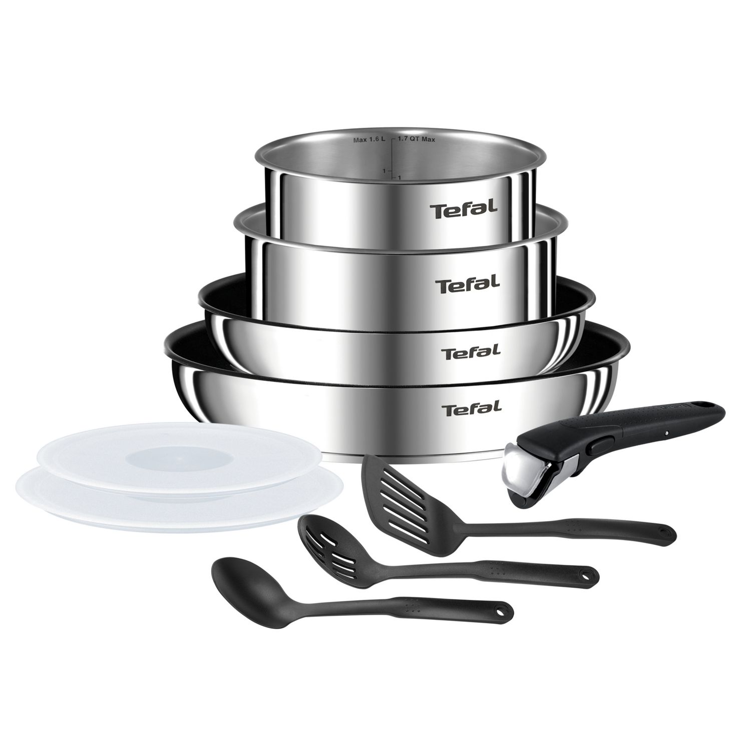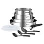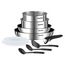 Composition : Poêles 22/26 cm + Casseroles 16/18cm (1,5/2,1L) + Couvercles hermétiques 16/18cm + Poignée amovible + 3 ustensiles