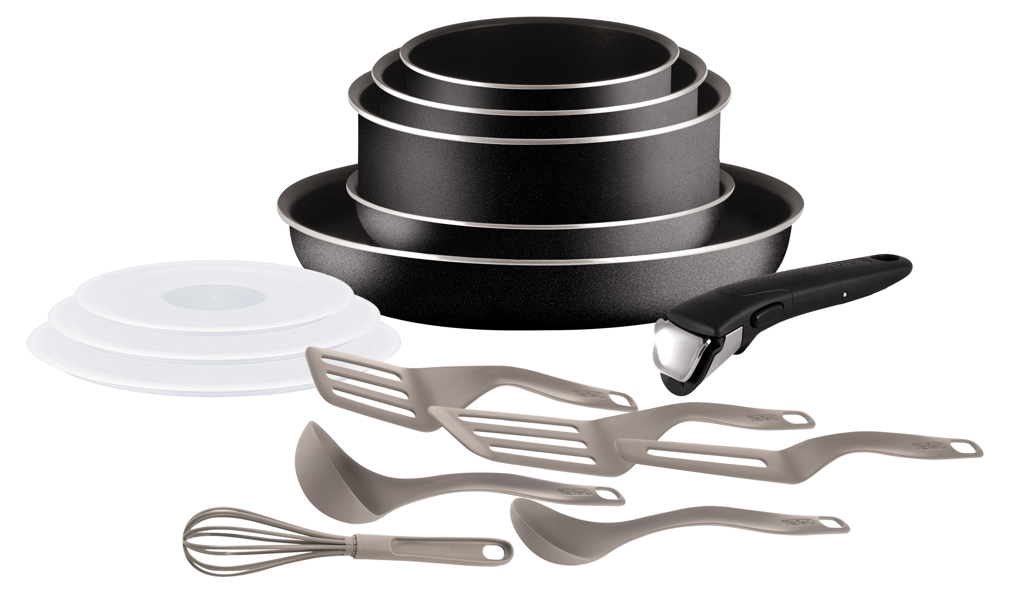 Casseroles 16/18/20 cm + Poêles 20/26 cm + Couvercles Hermétiques 16-18-20 cm + Poignée Ingenio amovible Classic Noir + 6 spatules enjoy cassonade (louche, angle, longue, crepe, cuillère, fouet).