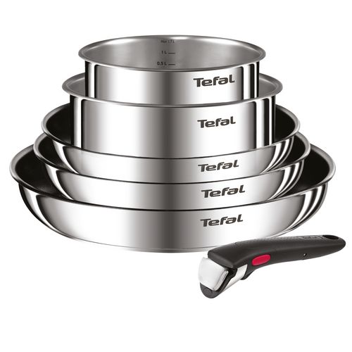 La batterie de cuisine 6 pièces INGENIO COOK EAT de TEFAL, compatible tous feux dont induction, vous offre polyvalence et praticité grâce à sa poignée amovibles. Composée de casseroles inox et de poêles antiadhésives, elle garantit une cuisson optimale et un rangement facile. Compatible lave-vaissel