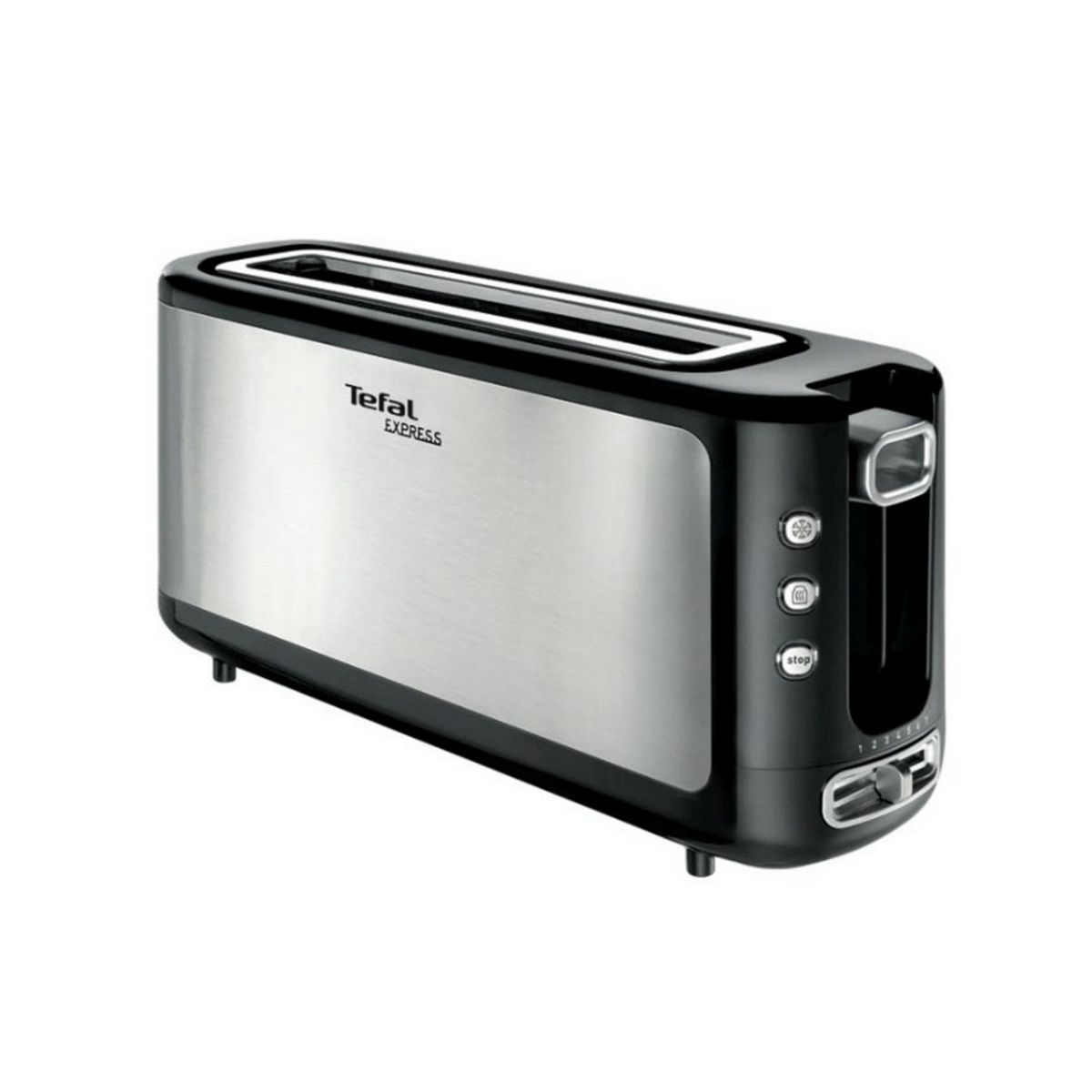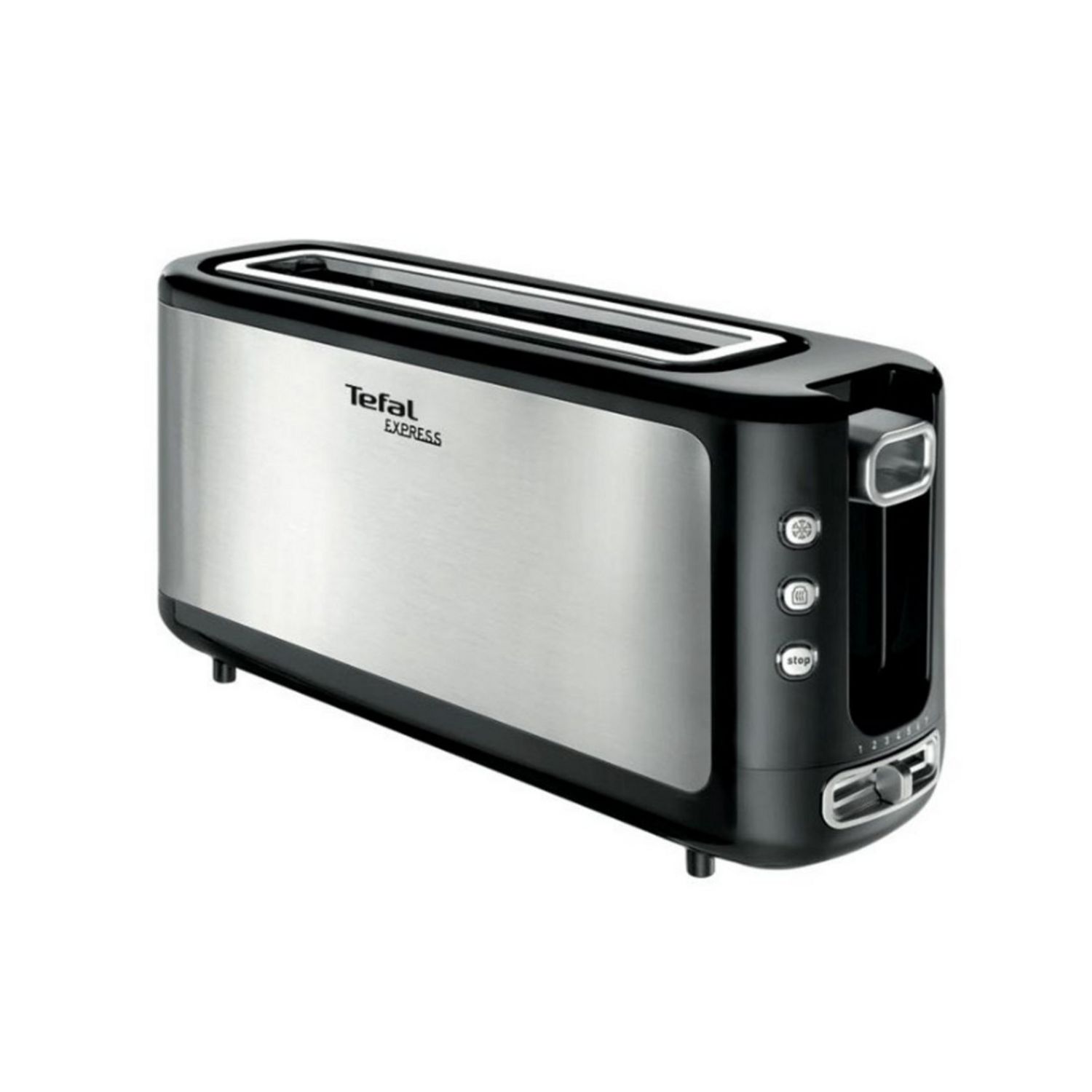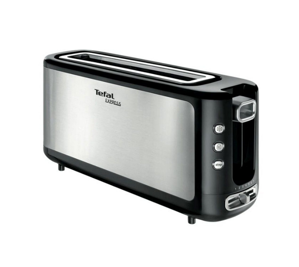 Tefal TL365ETR Le grille-pain inox TL365ETR avec chambre de grillage en longueur vous permet de griller facilement tranches de baguettes et toasts qu'ils soient frais, congelés ou déjà grillés grâce aux fonctions décongélation et réchauffage.