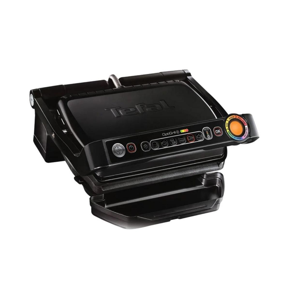 Tefal GC712812 Avec le grille-viande OptiGrill+ GC712812 de Tefal, notre dernière innovation, la technologie intelligente se met au service d'une cuisson optimale. Grâce à des capteurs automatiques de cuisson, le temps et la température de cuisson sont automatiquement ajustés en fonction de l'épaisseur et du nombre d'aliments placés sur le barbecue. 6 programmes de cuisson (Hamburger, Volaille, Sandwich, Saucisse, Viande rouge, Poisson) et un mode de cuisson pour les aliments surgelés sont disponibles. En même temps, un témoin lumineux permet de suivre l'évolution de la cuisson : violet pour le préchauffage, bleu puis vert au début de la cuisson, jaune lorsque les morceaux sont saignants, orange lorsqu'ils sont à point et enfin rouge quand ils sont bien cuits. Les goûts de tout le monde seront satisfaits : il vous suffit d'ouvrir le couvercle et de retirer votre aliment lorsqu'il est cuit comme vous l'aimez ! Le mode manuel supplémentaire de ce barbecue avec 4 niveaux de température vous permet de cuire tous vos aliments comme vous le souhaitez. Idéal pour les fruits et légumes. Découvrez OptiGrill Black Edition, doté d'un design élégant qui s'intégrera à merveille dans votre cuisine.