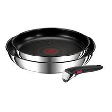 Lot de 2 poêles marque POUCE 22 et 26 cm inox revêtu INGENIO PREFERENCE Tefal avec poignée amovible. Revêtement antiadhésif Titanium x6, compatible tous feux dont induction. Fabriqué en France, pratique et durable pour une cuisine quotidienne de qualité.
