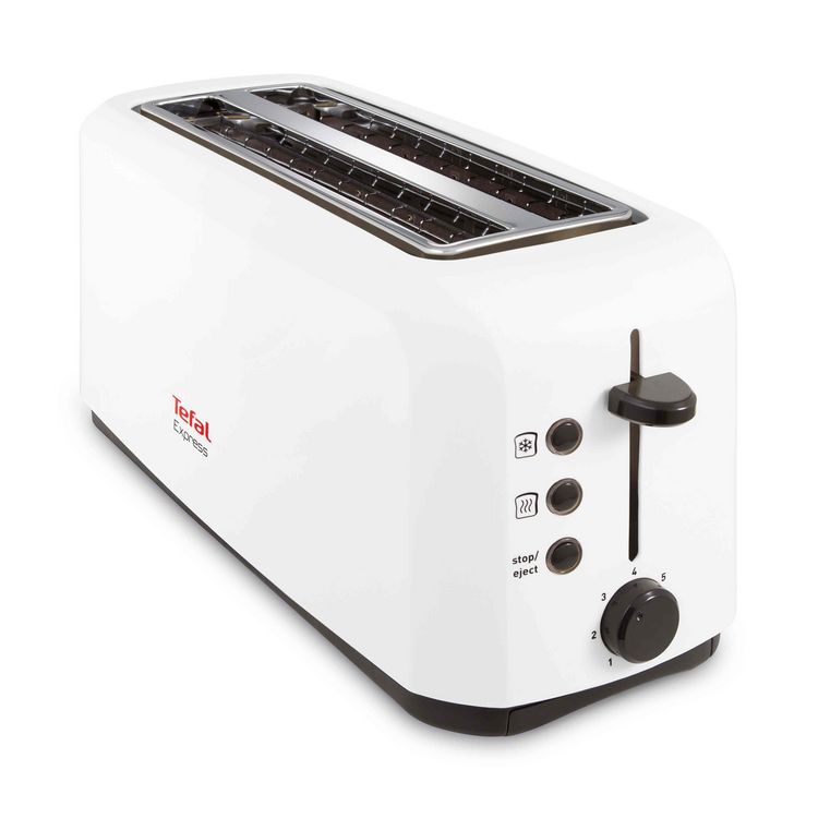Grille-pain blanc "MAXI FORMAT" avec 2 chambres de grillage extra longues pour griller facilement plusieurs tranches de baguettes et toasts simultanément quâils soient frais ou congelés.