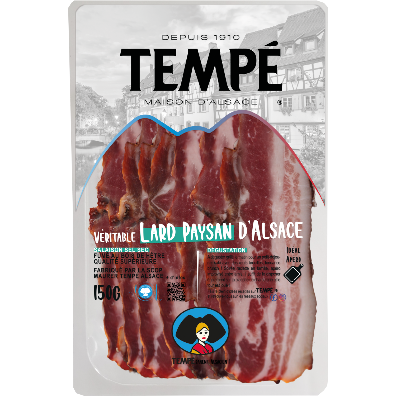 Ce lard, salé à la main et agrémenté d'épices, est fumé naturellement à basse température avec de véritables bûches de bois de hêtre pendant 18j, ce qui lui confère une saveur unique.