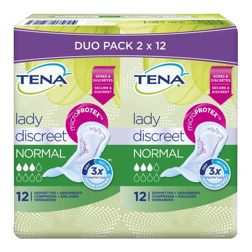 Les serviettes TENA lady discreet sont 20% plus fines mais toujours aussi sûres, grâce à la nouvelle technologie micriPROTEXTM. Les nouvelles serviettes TENA lady discreet offrent encore plus de discrétion et plus de féminité : - une forme anatomique et un matelas affiné pour plus de discrétion - un voile de surface imprimé au design plus féminin - un produit directement collé sur sa pochette individuelle pour une utilisation plus pratique Et une TRIPLE PROTECTION pour une SECURITE optimale - CONTRÔLE DES ODEURS pour une fraîcheur longue durée grâce au système Fresh Odour Control ™ - BIEN AU SEC grâce à un voile de surface à absorption rapide TENA Lady Discreet Normal Duopack 2x12 Serviettes