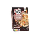 Ingrédients : Ingrédients : viande de veau origine France 55%, eau, carotte 12,5%, crème (Lait) 7,5 %, champignons de Paris 5.0%, oignons, beurre (Lait), amidon, sel, plantes aromatiques, épices, arômes naturels, jus de carotte concentré, jus de champignon concentré.