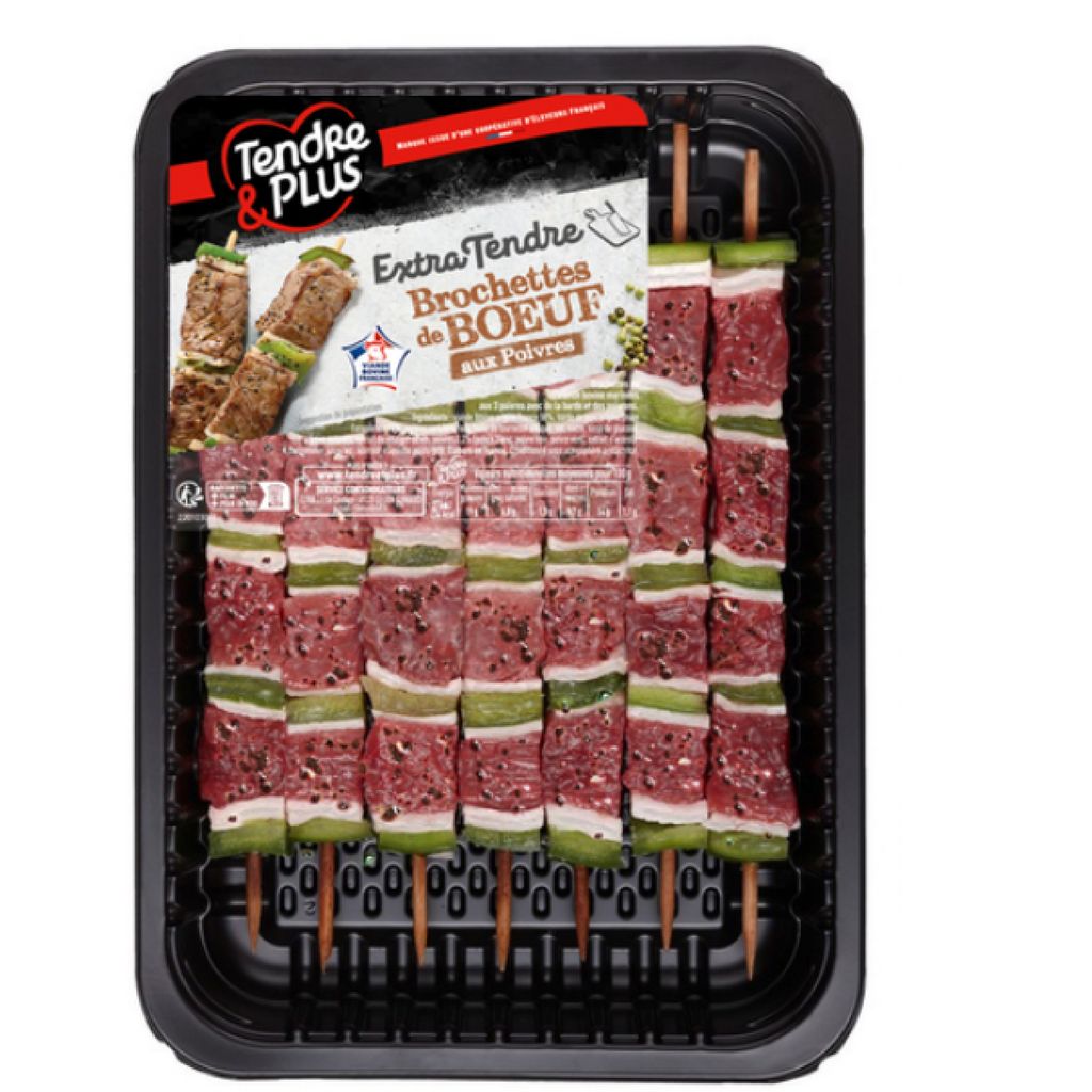 Brochettes de viande bovine marinées aux 3 poivres avec de la barde et des poivrons.
