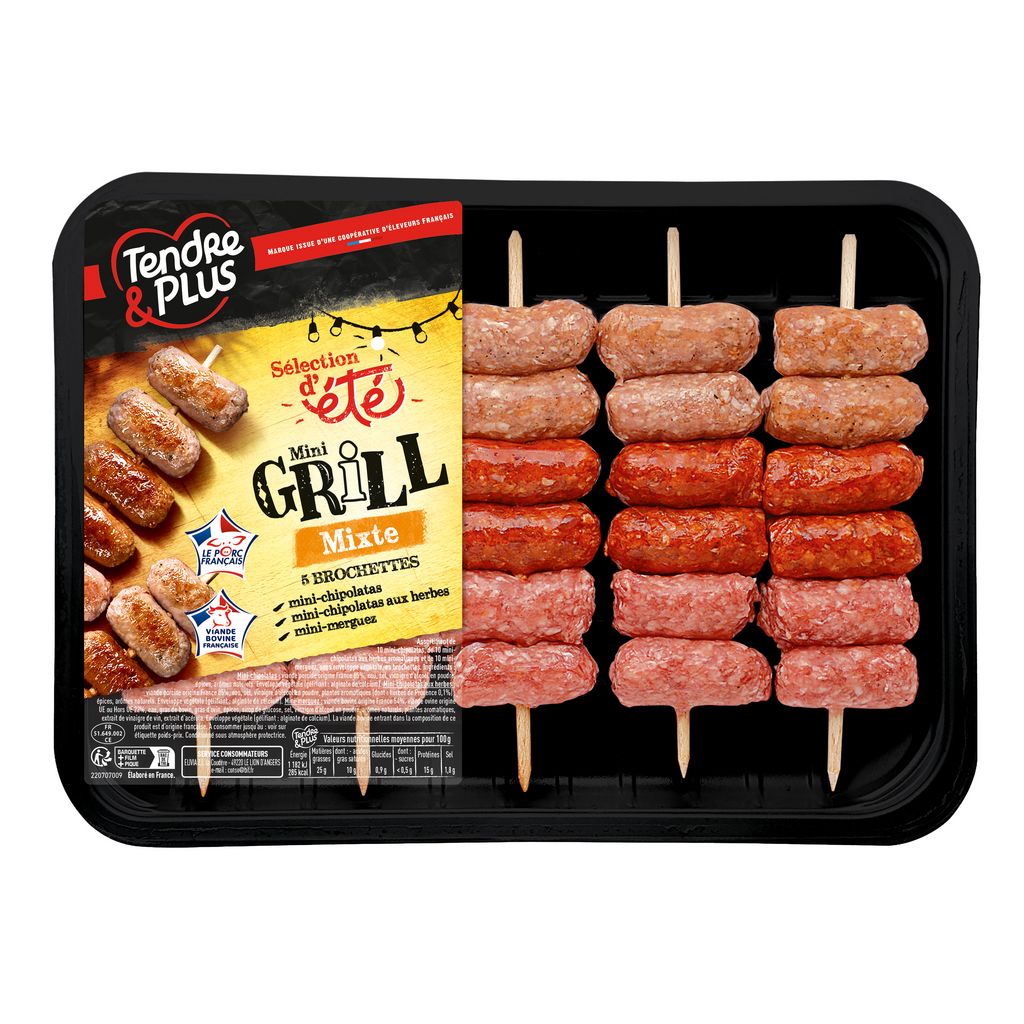 Ingrédients : Ingrédients : Mini-chipolatas : viande porcine origine France 85%, eau, sel, vinaigre d’alcool en poudre, épices, arômes naturels. Enveloppe végétale (gélifiant : alginate de calcium). Mini-chipolatas aux herbes : viande porcine origine France 85%, eau, sel, vinaigre d’alcool en poudre, plantes aromatiques (dont : herbes de Provence 0,1%) , épices, arômes naturels. Enveloppe végétale (gélifiant : alginate de calcium). Mini-merguez : viande bovine origine France 54%, viande ovine origine UE ou Hors UE 22%, eau, gras de bovin, gras d’ovin, épices, sirop de glucose, sel, vinaigre d’alcool en poudre, arômes naturels, plantes aromatiques, extrait de vinaigre de vin, extrait d’acérola. Enveloppe végétale (gélifiant : alginate de calcium). La viande bovine entrant dans la composition de ce produit est d’origine française.