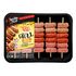 Assortiment de 10 mini-chipolatas, de 10 mini-chipolatas aux herbes aromatiques et de 10 mini-merguez, sous enveloppe végétale, en brochettes.