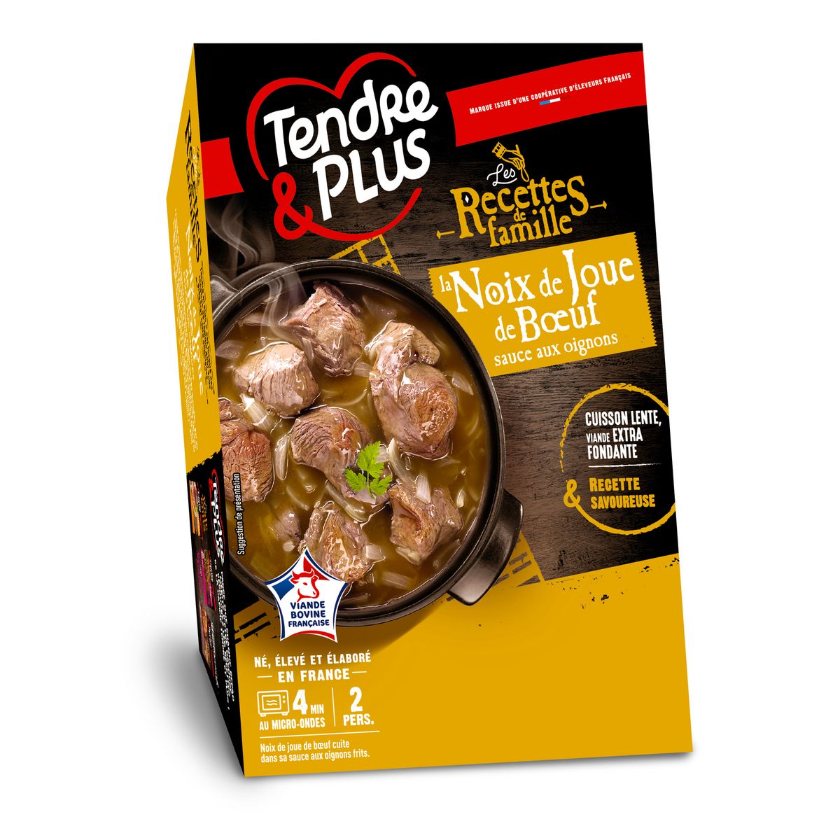 Ingrédients : Ingrédients : noix de joue de bœuf origine France 65%, eau, dextrose, oignons déshydratés 2,1%, oignons frits déshydratés 1,5% (oignons, huile de tournesol oléique), vinaigre d'alcool, sel, arôme naturel, amidons, fibres végétales. Traces de lait et de gluten.