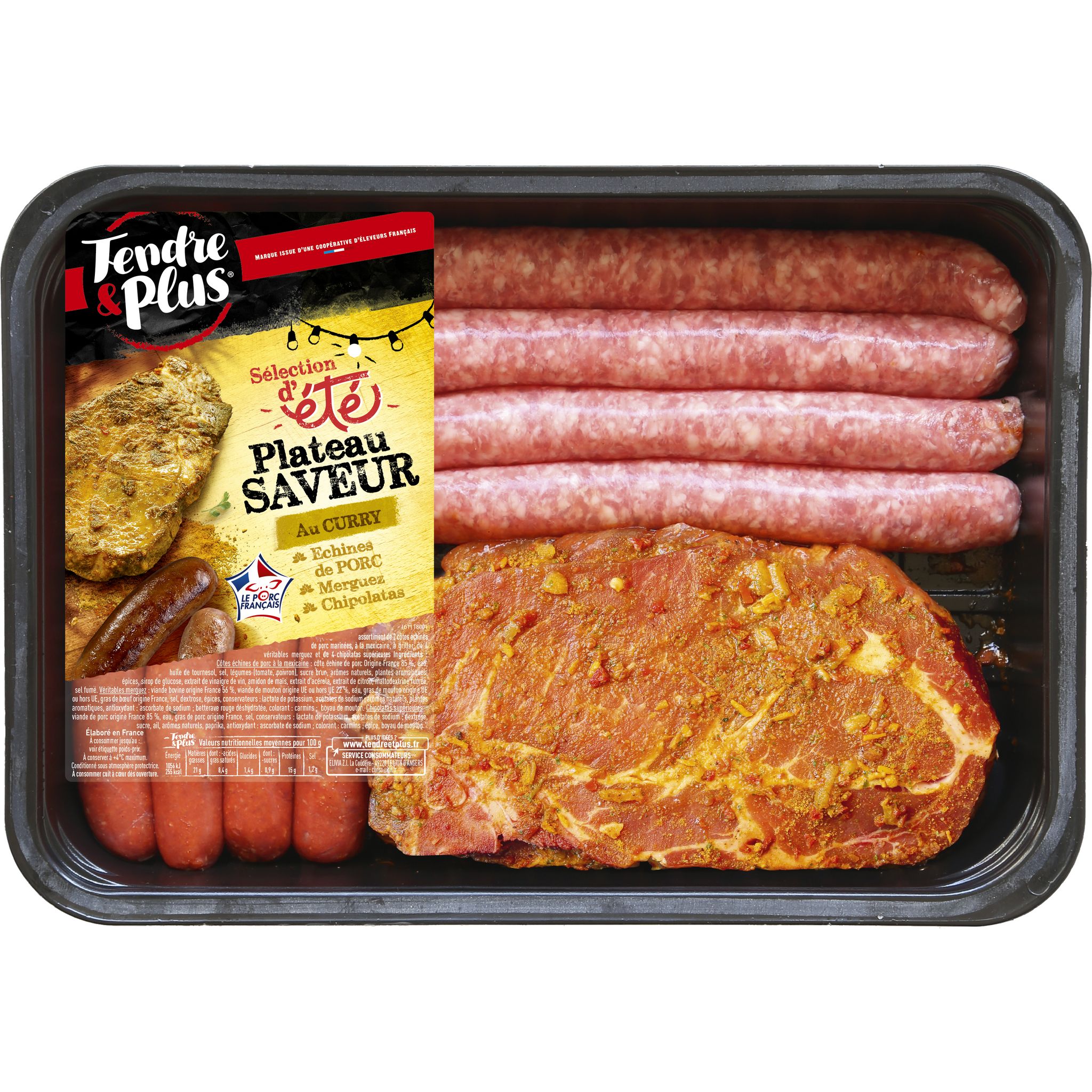 Ingrédients : Ingrédients : Côtes échines de porc au curry : côtes échines de porc origine France 90%, eau, sel, huile de tournesol, curry 0,7%, maltodextrine, poivron, plantes aromatiques, arômes naturels, semoule de riz, noix de coco, sirop de glucose, extrait de vinaigre de vin, huile d'olive, extrait d'acérola. Véritables merguez : viande bovine origine France 56%, viande de mouton origine UE ou hors UE 22%, eau, gras de mouton origine UE ou hors UE, gras de bœuf origine France, sel, dextrose, épices, conservateurs : lactate de potassium, acétates de sodium ; arômes naturels, plantes aromatiques, antioxydant : ascorbate de sodium ; betterave rouge déshydratée, colorant : carmins ; boyau de mouton. Chipolatas supérieures : viande de porc origine France 85%, eau, gras de porc origine France, sel, conservateurs : lactate de potassium, acétates de sodium ; dextrose, sucre, ail, arômes naturels, paprika, antioxydant : ascorbate de sodium ; colorant : carmins ; épice, boyau de mouton. Traces de gluten et de lait.