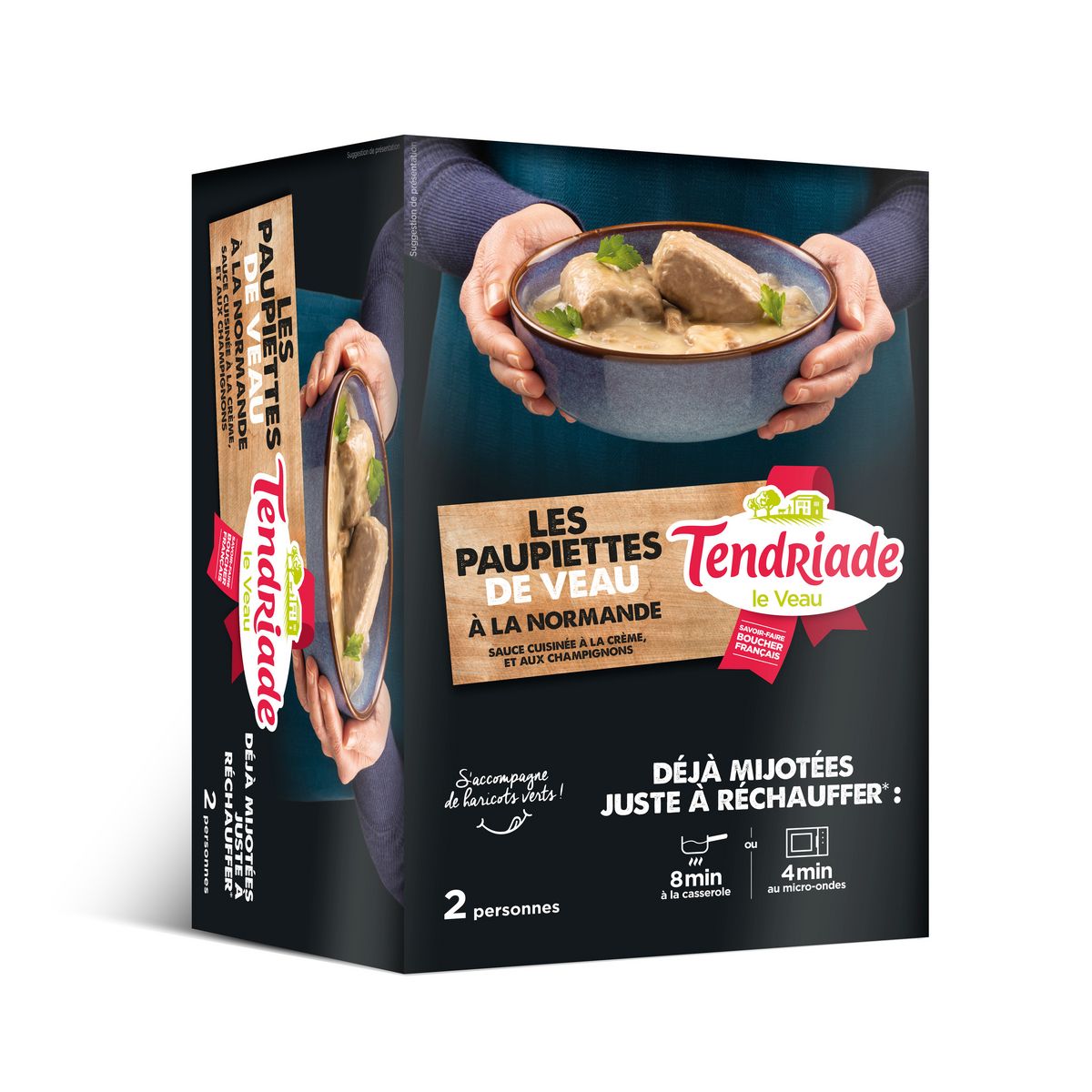 Présentées dans un sachet pour deux personnes, les paupiettes de veau à la Normande Tendriade sont prêtes à déguster ! Fondantes et longuement mijotées dans une sauce onctueuses à la crème, aux champignons et au cidre doux, les paupiettes ne nécessitent que quelques minutes de remise en œuvre. Ce plat préparé se marie très bien avec du riz ou des légumes verts !