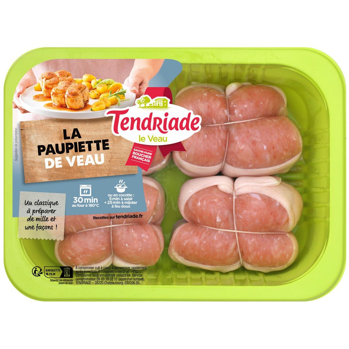 Les paupiettes de veau sont inratables grâce à Tendriade. Elles sont faciles et rapides à cuisiner. Les bouchers Tendriade ont soigneusement préparé les paupiettes de veau. L'enveloppe de veau entoure la farce, préparée avec du veau, du porc , du vin blanc, de la ciboulette ciselée et des petits oignons. Elles sont idéales pour les repas en Famille ou entre Amis, et me procure un vrai petit plaisir.