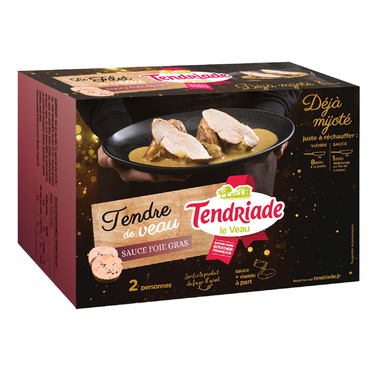 Ingrédients : Ingrédients: Paleron de veau (71 %), sauce foie gras (25%) :Eau, crème (LAIT), foie gras de canard 2,5 %, beurre (LAIT), arôme naturel, Cognac, amidon transformé de manioc, sel, brisures de truffes noires au jus [brisures de truffes noires (Tuber melanosporum Vitt.), jus de truffe, eau, sel], épaississant : E415, poivre blanc. Beurre (4%) :( Beurre, sel) (LAIT). Viandes : Origine UE. A consommer rapidement après ouverture.