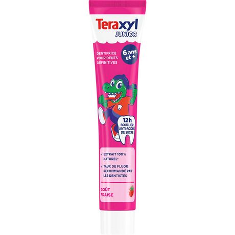 Ce dentifrice Teraxyl Junior est spécialement développé pour les enfants âgés de 6ans et plus. Il protège les premières dents définitives des caries. Combat pendant 12h les acides de sucre générés par les aliments et boissons sucrés, la principale cause de caries Aide à renforcer l'émail des dents grâce à sa formule au Calcium.