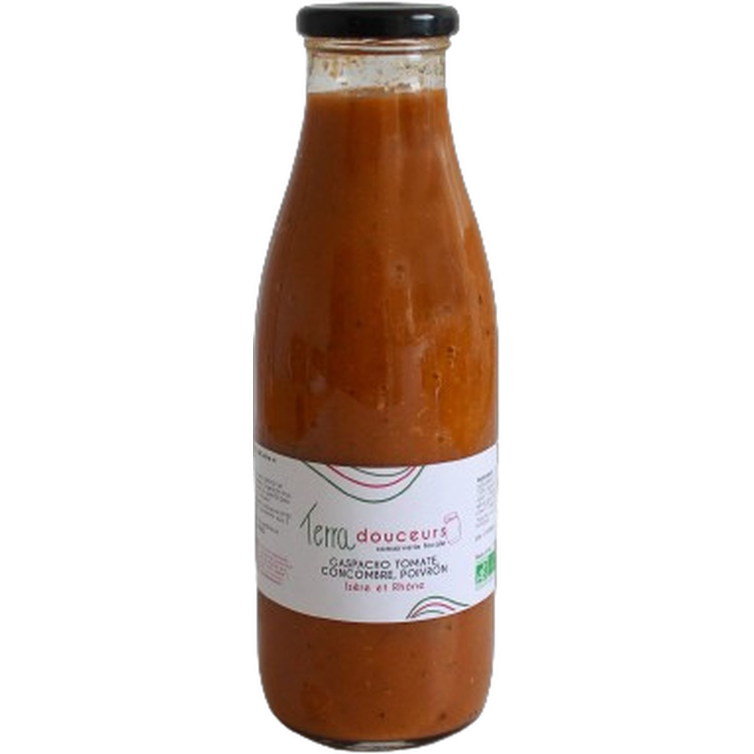 Tomate, concombre, poivron, oignon, huile de colza, vinaigre de cidre( contient SULFITES), sel de Guérande, ail, piment, origan, eau de cuisson.