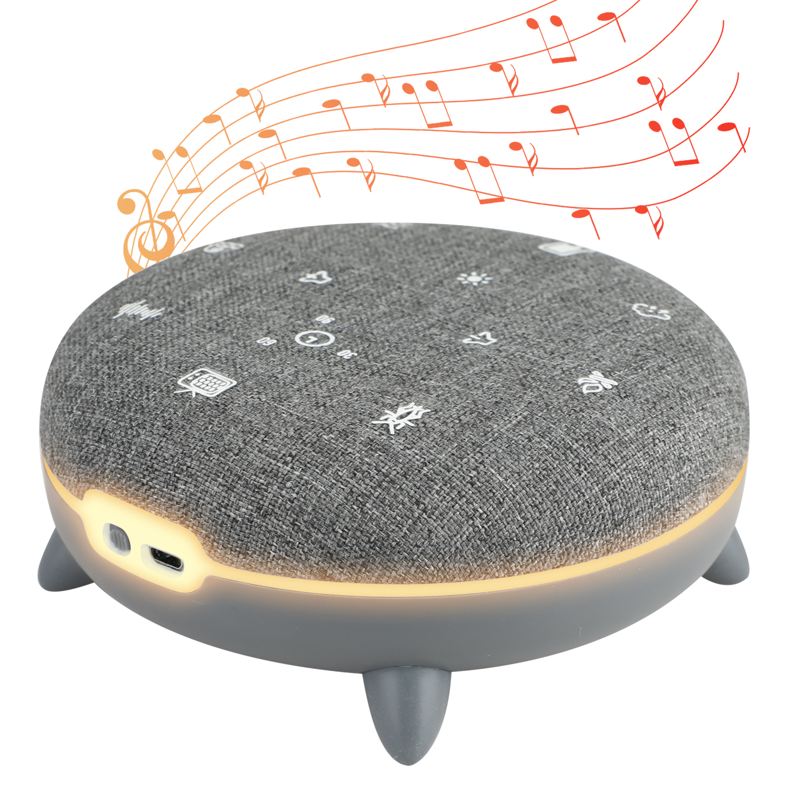 7 sons apaisants, 8 ambiances lumineuses, Bluetooth, Durée réglable de 30 à 90 min, Volume ajustable, Temps de charge 2.5 h