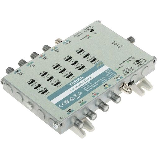 Le Amplificateur Terra SA-51D est un amplificateur performant conçu pour les systèmes SMATV. Il dispose de 5 entrées, dont 4 pour satellite et 1 pour DVB-T/Radio, offrant une répartition homogène du signal. Son boîtier blindé protège contre les interférences, garantissant une qualité d'image optimal