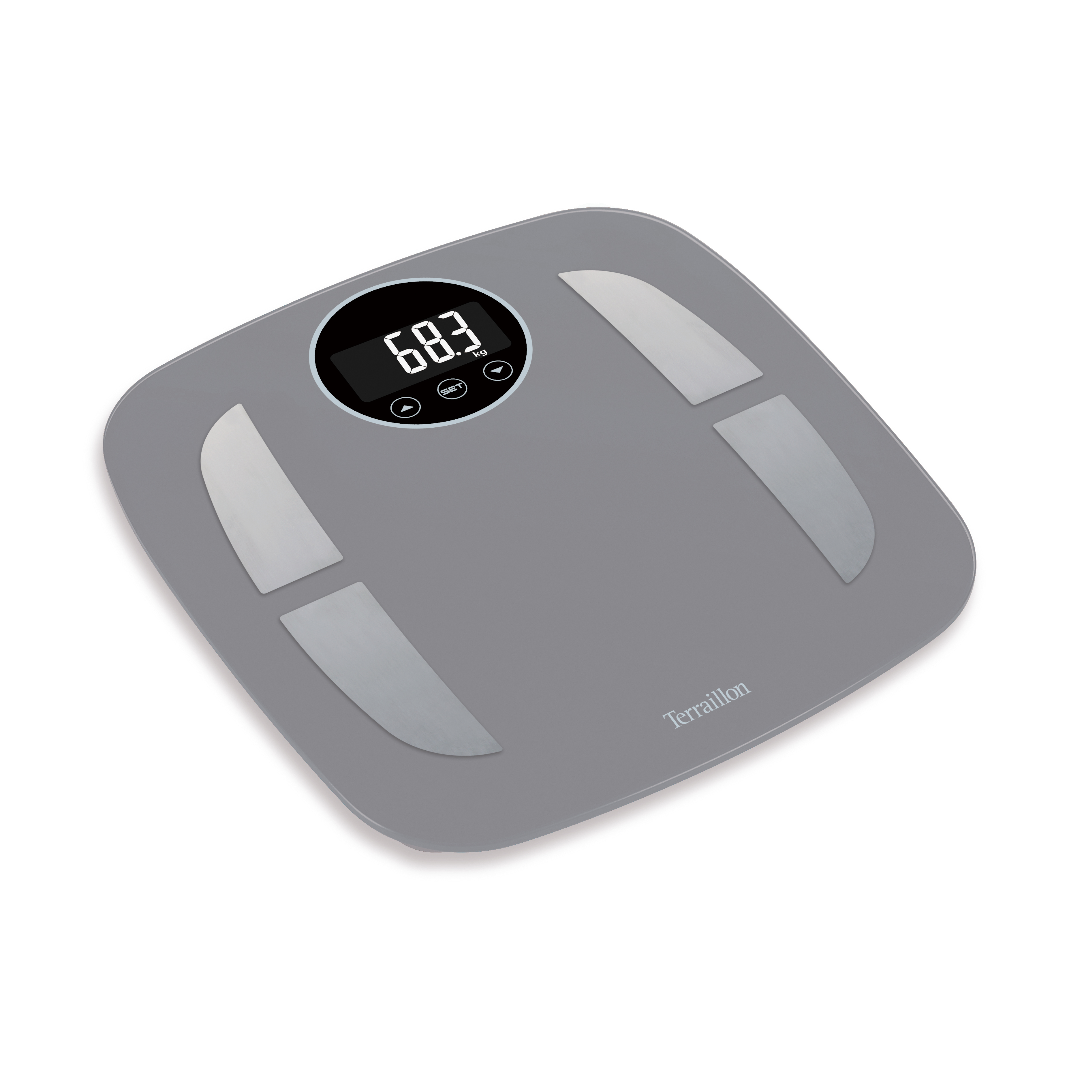 Découvrez le pèse personne impédancemètre Terrailon Power Fit en gris. Avec sa capacité de 160 kg, son plateau en verre trempé et sa fonction d'analyse corporelle, il vous permet de surveiller votre poids et votre composition corporelle. Pratique, il peut mémoriser les données de 12 utilisateurs et dispose d'un mode athlète pour des mesures plus précises des personnes pratiquant une activité physique régulière.