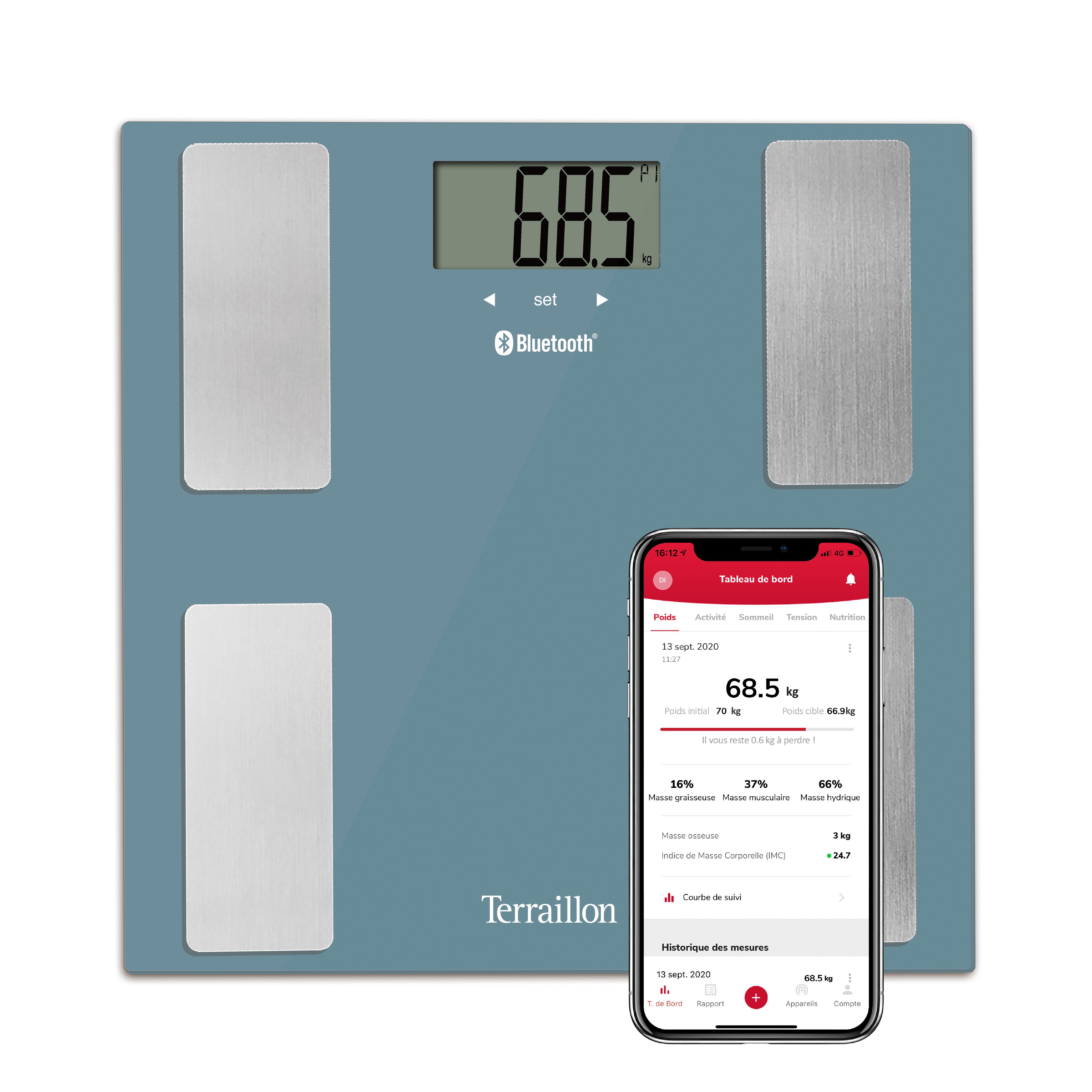 Capacité max 160 kg, Graduation 100 g, Plateau en verre 30x30 cm, IMC, Connecté, 8 utilisateurs