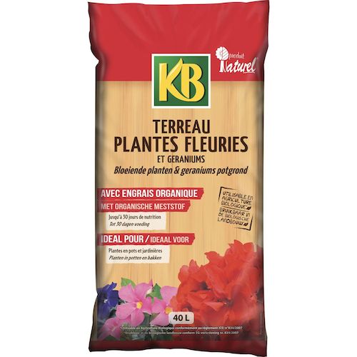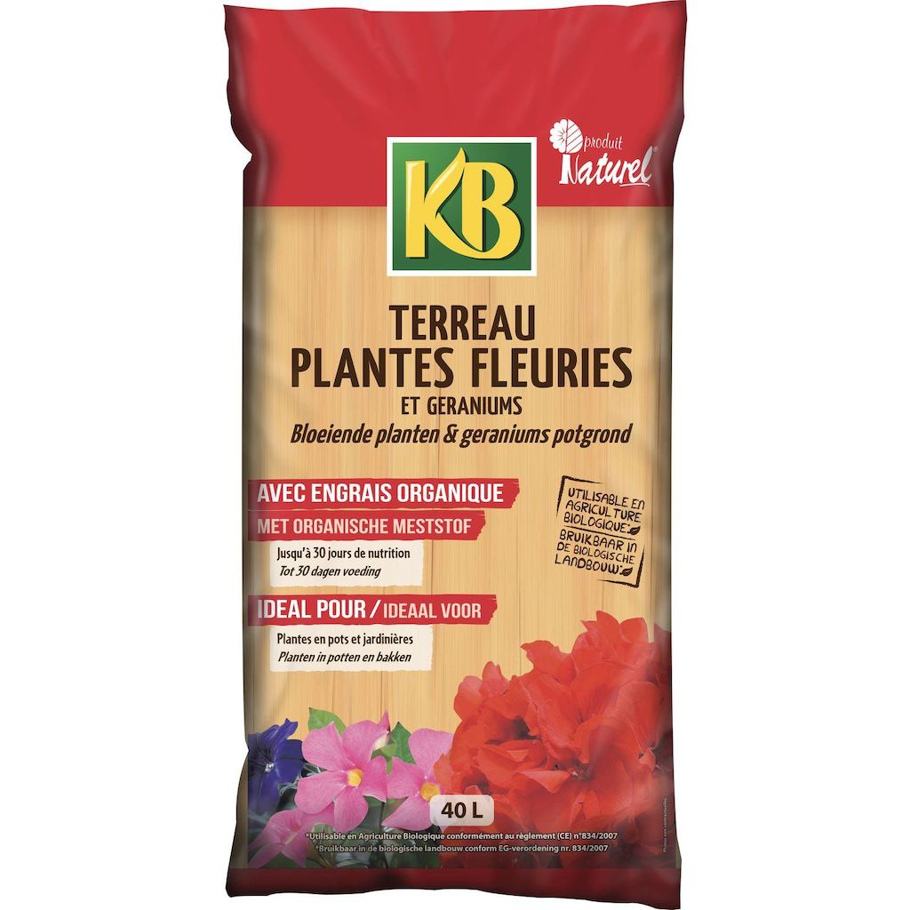 KB terreau plantes fleuries et géraniums 40 L. Pour la plantation et le rempotage de toutes vos plantes à fleurs. Favorise la croissance et la floraison. Produit naturel et utilisable en agriculture biologique. Fabriqué en France.
