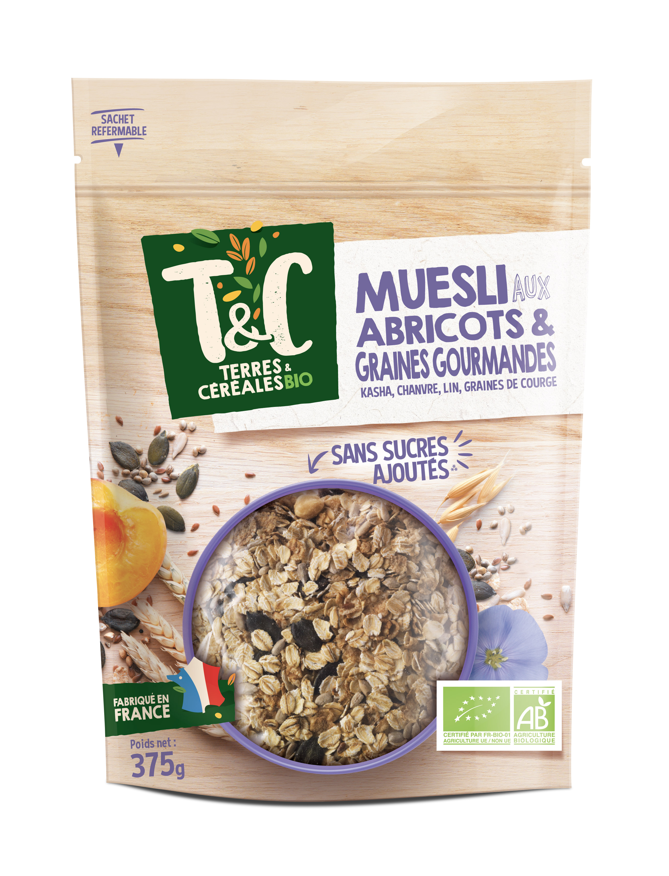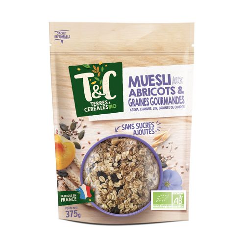 Flocons d’AVOINE* complets 56%, graines de tournesol* 15%, pétales de BLÉ* 8%, abricots secs* (abricots* 6,6%, farine de riz*), graines de courges* 6%, graines de chanvre* 2%, graines de lin brun*2%, kasha* 2%, NOISETTES grillées* 1,5%. * Ingrédients issus de l’Agriculture Biologique.