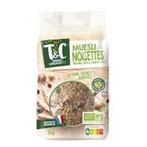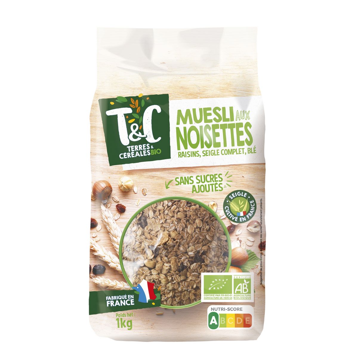Flocons de SEIGLE*complets 70%, raisins secs* (raisins* 11%, huile de tournesol*), pétales de BLÉ* 10%, NOISETTES grillées* 8%.