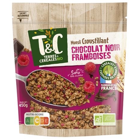 Muesli croustillant au chocolat noir et framboises bio