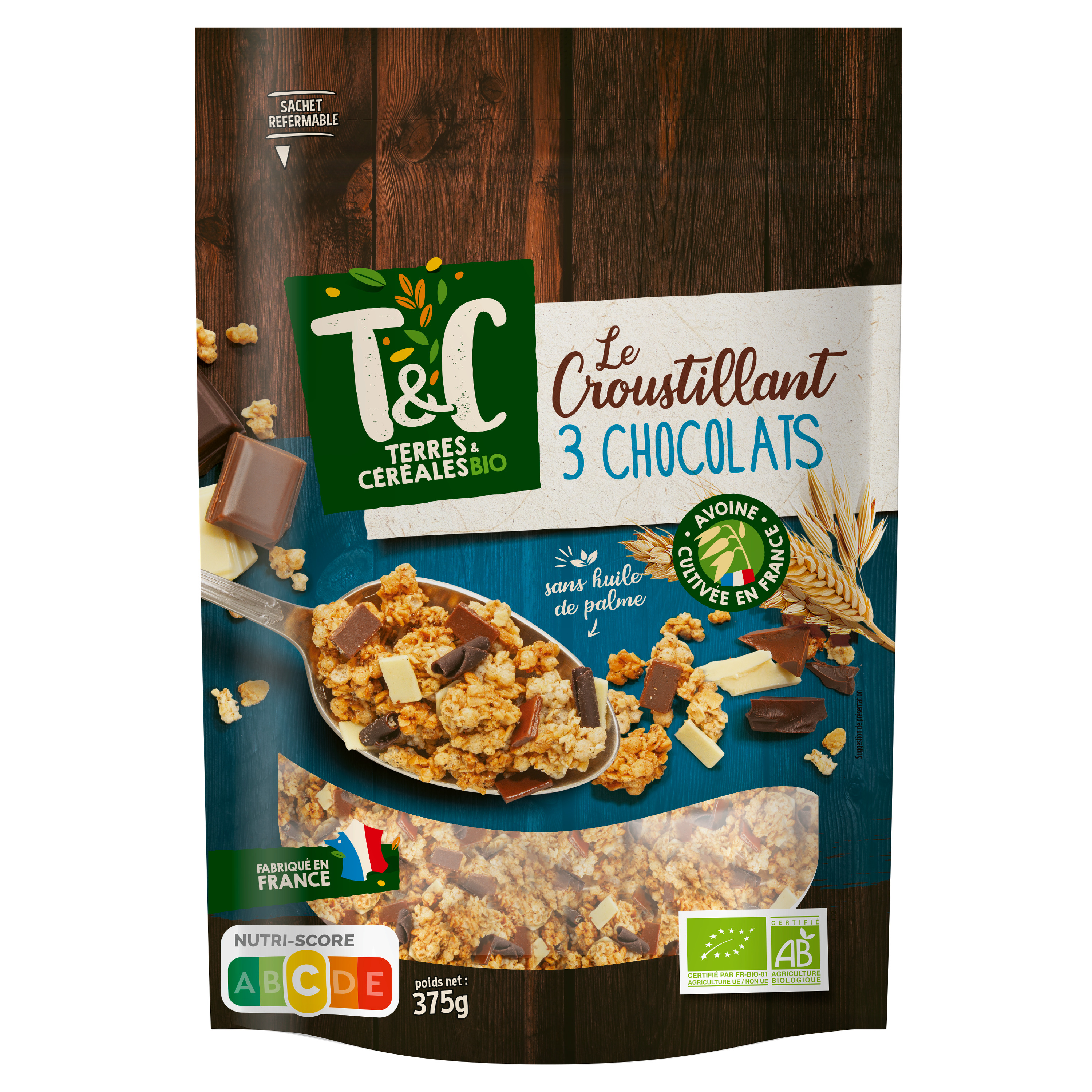 Le croustillant 3 chocolats est composé de pépites de céréales complètes lentement dorées au four afin de les rendre irrésistiblement croustillantes. Elles sont accompagnées de paillettes de chocolat blanc et lait ainsi que de fins copeaux de chocolat noir au goût intense.