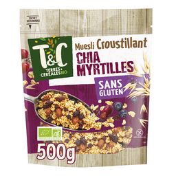 Flocons d'AVOINE complets* sans gluten 56%, sucre de canne complet*, huile de tournesol*, billettes de riz* (riz*, sel), sirop de riz*, canneberges séchées sucrées* (canneberges* 3%, sucre de canne*, huile de tournesol*), farine de tapioca*, AMANDES grillées* 2,9%, graines de chia* (Salvia hispanica) 2,2%, myrtilles lyophilisées* 1,5%. * Ingrédients issus de l’Agriculture Biologique.