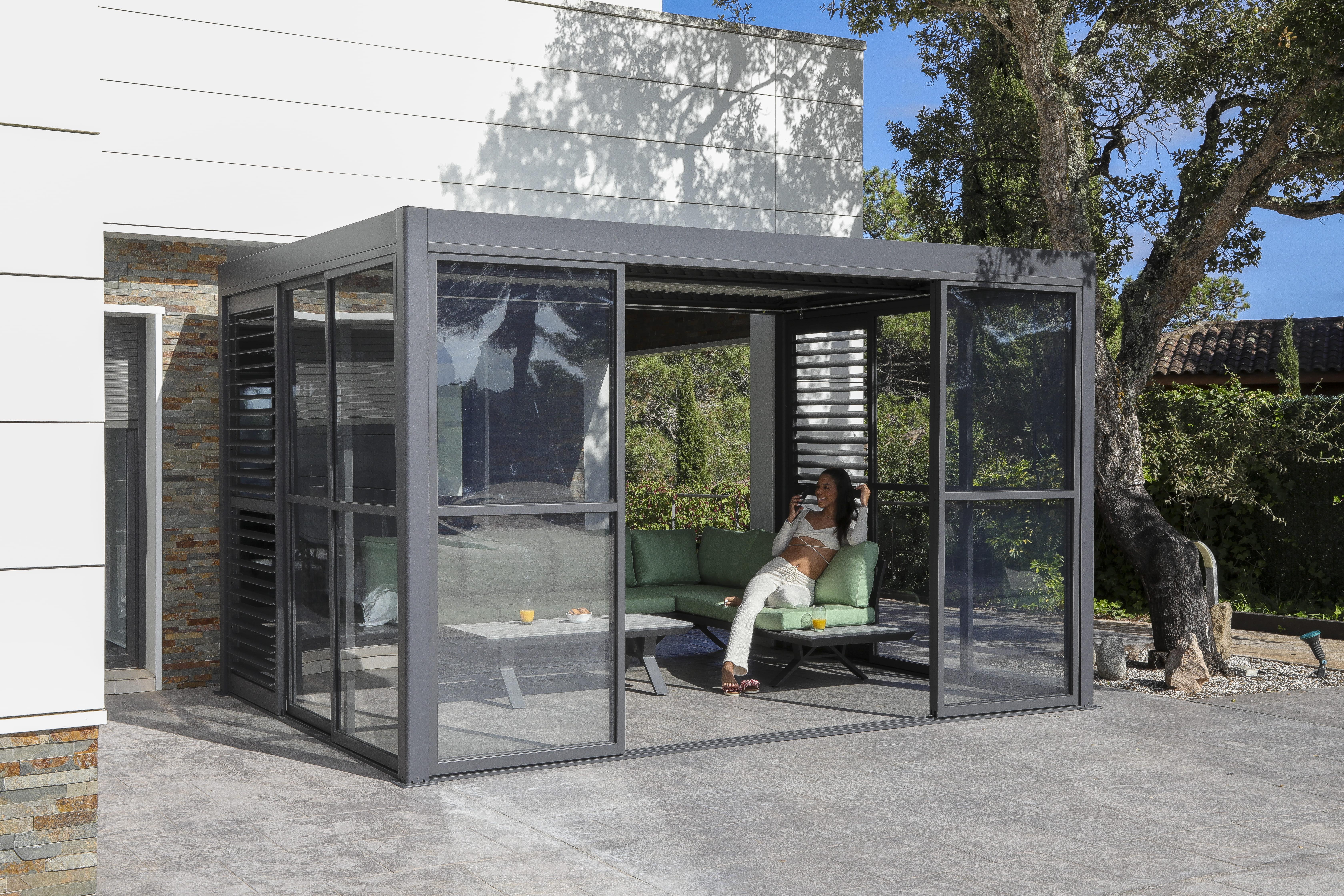 Structure aluminium, peinture époxy grise, lattes inclinables blanche, pieds 10x10 cm, son système de lames amovibles blanches permet d'adapter la lumière en fonction des rayons de soleil et d'offrir une aération optimale. Avec ses portes coulissantes elle devient une véranda, éclairage LEDS par énergie solaire. Vendue en option portes en verre de 3.5 mm et portes persiennes avec lattes en aluminium.