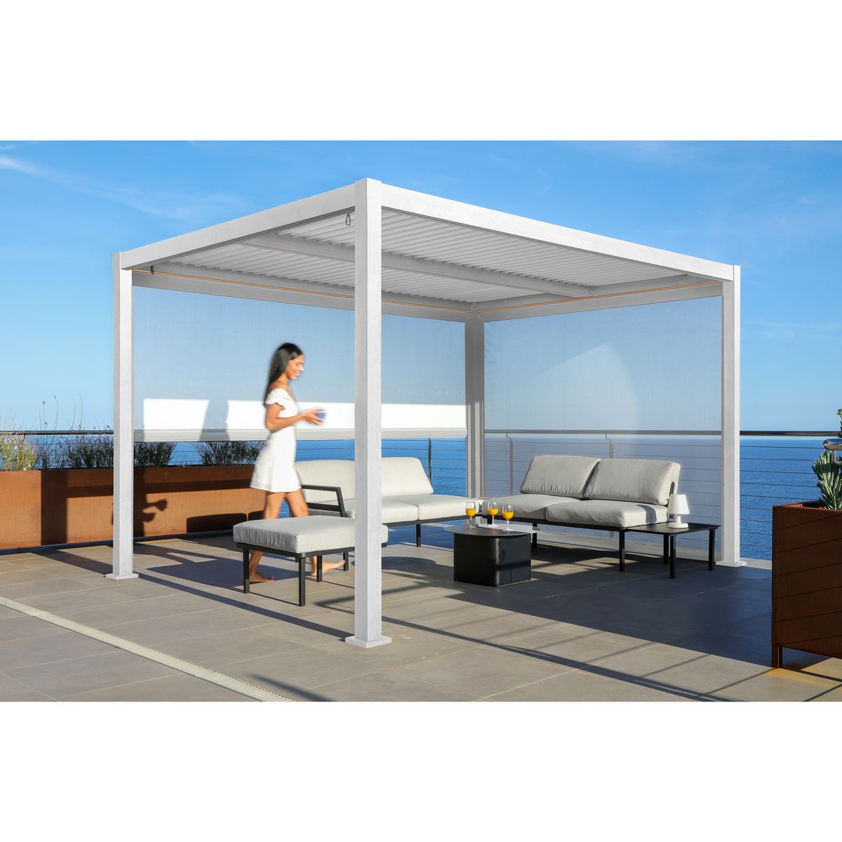 Structure aluminium, finition bois cérusé, lattes inclinables parfaitement étanche à l'eau, pieds 10x10 cm, son système de lames amovibles blanches permet d'adapter la lumière en fonction des rayons de soleil et d'offrir une aération optimale. Éclairage LED géré par énergie solaire.