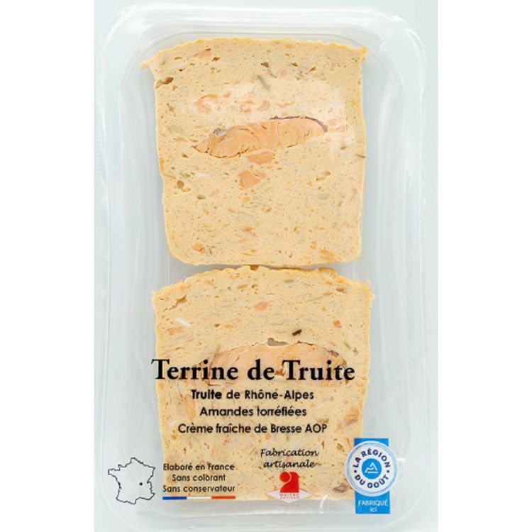 Ingrédients : TRUITE 65 %, eau, CREME AOP pasteurisée 6%, OEUFS pasteurisés, AMANDES 4,5%, fécule de manioc, jus de citron, sel, gélatine de poisson, vinaigre tamponné, poivre.