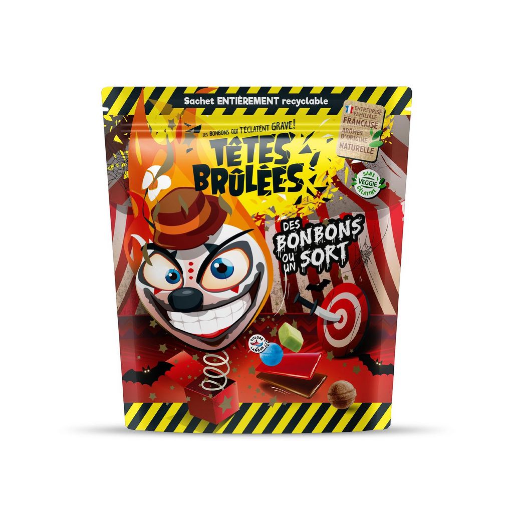 Têtes Brûlées c'est du fun des sensations, des délires entre potes et un max de plaisir. Les Têtes Brûlées existent sous différentes formes : des billes, des barres, des gélifiés, sous différents parfums : cola, fraise, pomme, framboise , yuzu .. et sous différents formats : petits ou grands sachets et des seaux.