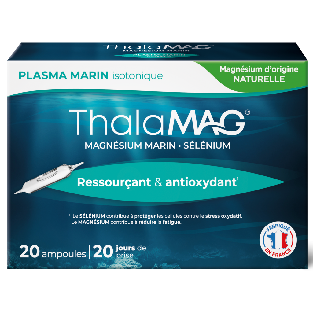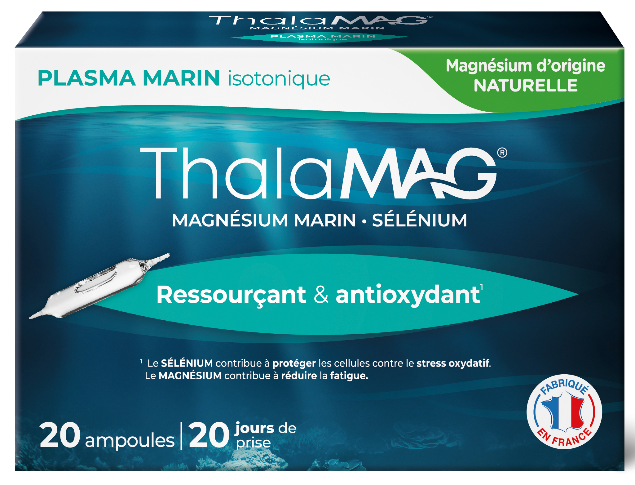 Thalamag Plasma Marin Ressourçant Le 1er complément alimentaire à base de plasma marin riche en magnésium et en sélénium ! Les Laboratoires IPRAD ont mis au point Thalamag Plasma Marin, dont la formule unique contribue à réduire la fatigue grâce au magnésium, participe au bon fonctionnement du système immunitaire et aide à protéger les cellules du stress oxydatif grâce au sélénium. Thalamag Plasma Marin est idéal au moment des changements de saison ou en convalescence, par exemple après une période d'état grippal.