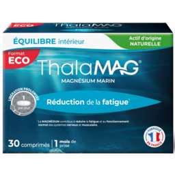 ThalaMAG® Equilibre intérieur vous aide à lutter contre la nervosité, la fatigue et la fatigue musculaire grâce à sa formule riche en magnésium marin. Le magnésium contribue à réduire la fatigue et participe au fonctionnement normal du système nerveux ainsi qu'à des fonctions musculaires et psychologiques normales. Grâce à l'ingrédient innovant et naturel SEPISMART™ SR, le comprimé libère progressivement le magnésium marin dans l'organisme pour en permettre une assimilation prolongée dans le temps.
