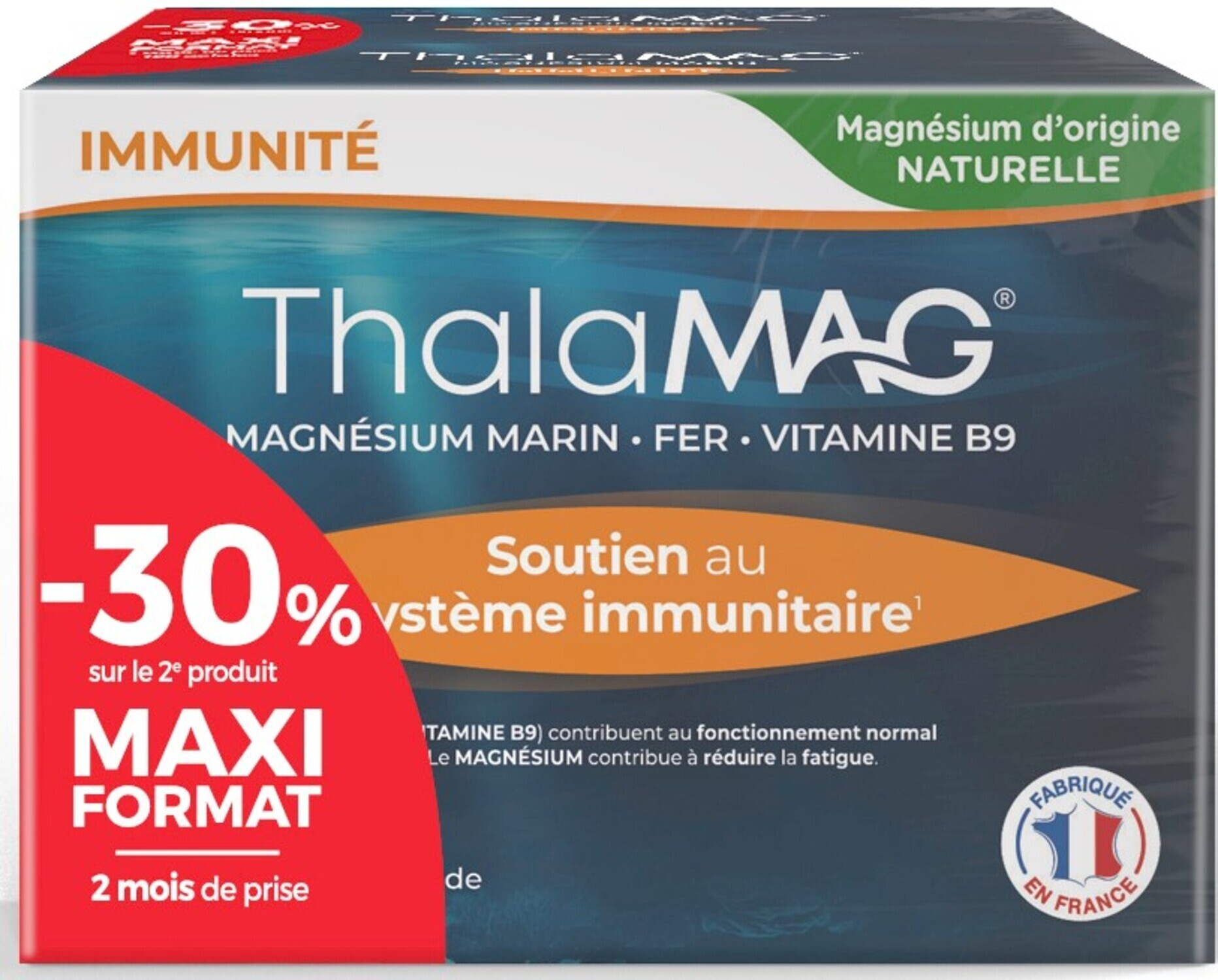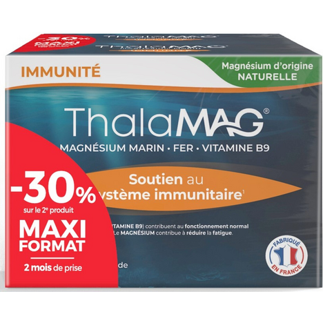 Le nouveau magnésium marin contenu dans THALAMAG tire sa force naturelle dans les profondeurs de la mer d'Irlande et participe à votre bien-être au quotidien. THALAMAG Forme physique & mentale vous aide à lutter contre la fatigue et le surmenage grâce sa formule riche en magnésium marin et en vitamine B9, qui vous aident à réduire la fatigue et participent à des fonctions psychologiques normales, ainsi qu'en fer qui aide à réduire la fatigue et participe à une fonction cognitive normale. Cette formule convient à toute la famille dès 6 ans et est particulièrement adaptée aux femmes dont les besoins en fer et vitamine B9 peuvent être augmentés au cours de la vie.