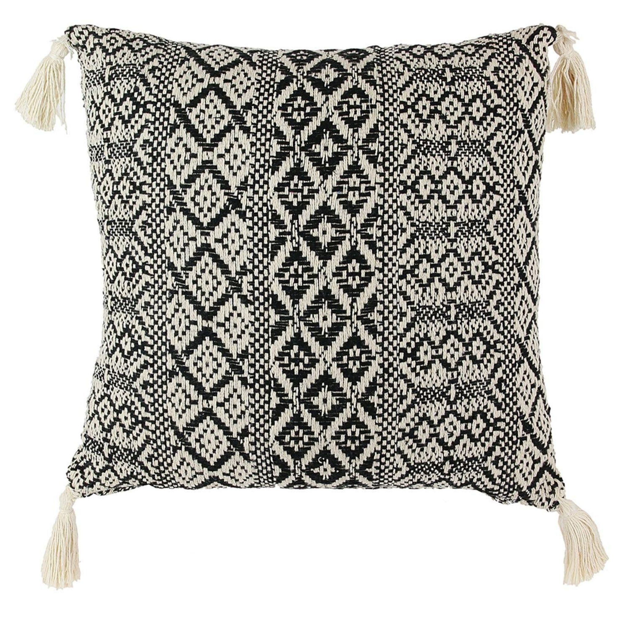Rehaussez le style de votre intérieur avec ce coussin d'inspiration ethnique. Vous serez séduit par son graphisme offrant des motifs géométriques ainsi que par les 4 pompons fixés à chaque extrémité.