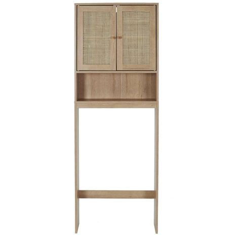 Optimisez l'espace de votre salle de bain avec élégance grâce à notre meuble de rangement conçu pour surplomber vos WC. Ce meuble combine un design intelligent et un style rustique chic avec ses portes en rotin et sa finition en bois clair, offrant une solution de rangement à la fois esthétique et p