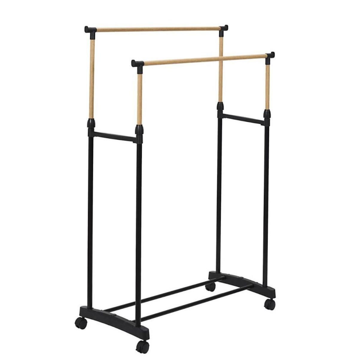 Ce portant à vêtements double à roulettes vous permettra de ranger vos vêtements avec efficacité. Avec ses 2 barres réglables en hauteur vous pourrez ranger bon nombre de vos vêtements avec style!Informations sur le portant double à roulettes effet bois :Couleur : noir, imitation boisDimension : L.