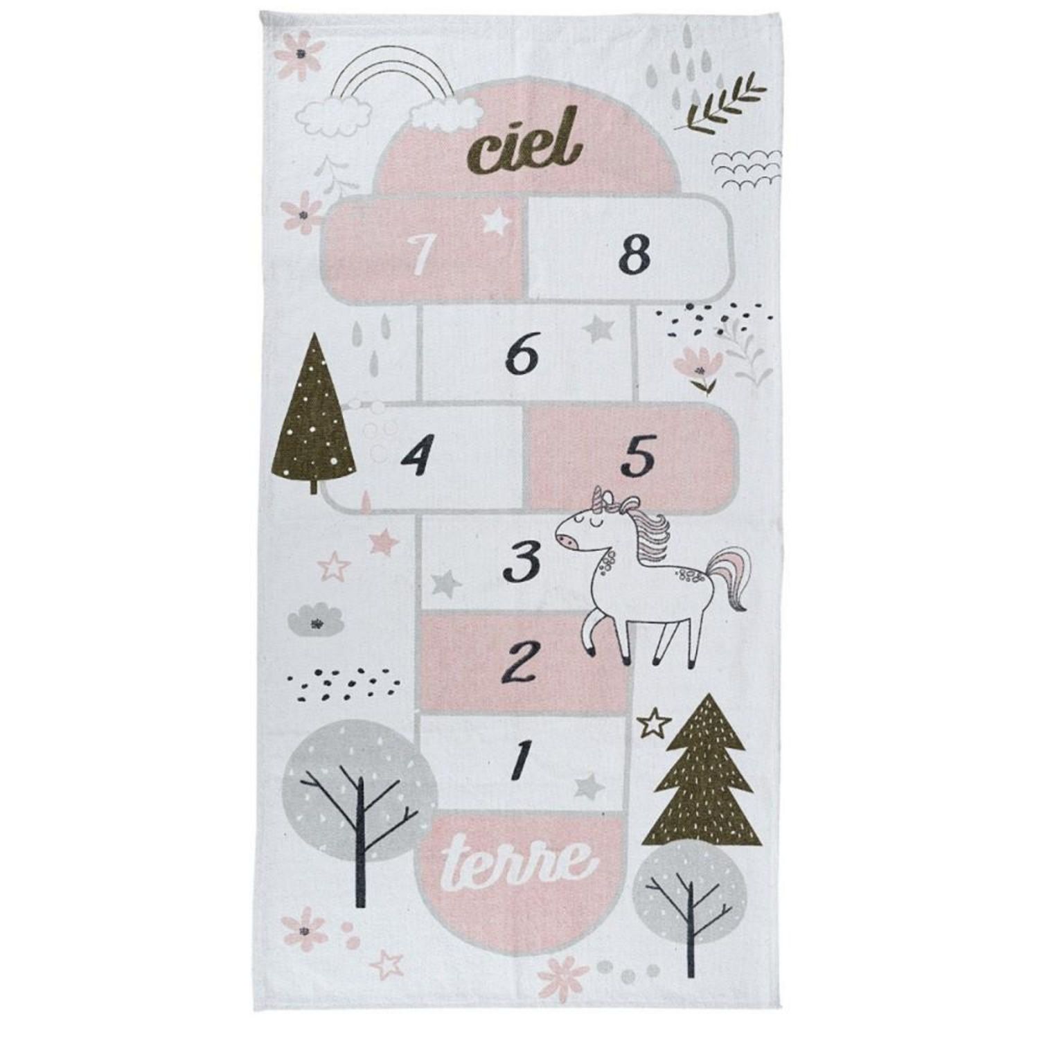 Tapis marelle 70x140 cmMagnifique tapis marelle pour s'amuser dans sa chambre ! Les enfants adorent le jeu de marelle, offrez-leurs ce joli tapis illustré, succès garanti avec son très joli imprimé de jeux de marelle rose et blanc avec licorne et arbres dorés !Informations sur le tapis marelle 70x14