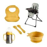 Le bavoir en silicone jaune à poche intégrée prévient les salissures, tandis que le bol en silicone avec ventouse puissante reste solidement fixé à la table. La tasse en acier inoxydable aux anses ergonomiques et les cuillères souples en silicone complètent cet équipement pensé pour l'autonomie progressive de l'enfant.