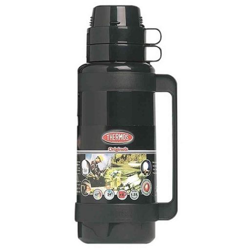 Thermos 061080 Bouteille isotherme Mondial Thermos 124944 avec isolation en verre par vide d'air, ampoule en verre. Conserve les boissons au froid 24 heures et au chaud pendant 12 heures. Comprend une tasse large. Poignée et protège-doigt. Bouchon à visser. Ecoulement facile des boissons. Le bouchon contient un compartiment pour stocker des sachets, des pots ou des morceaux de sucre. La large ouverture et la finition en plastique permettent de pouvoir manger directement dans le porte-aliments.