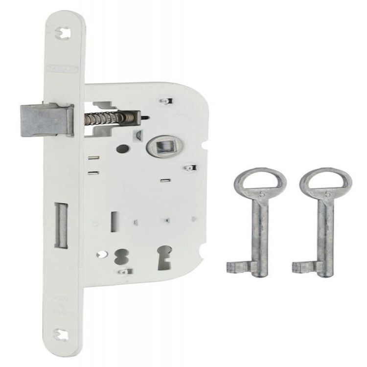 Serrure à encastrer réversible axe 40x70 mm pêne dormant 1/2 tour, 2 clés, finition blanc