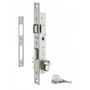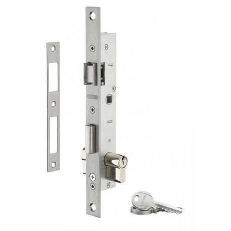 Serrure pour porte menuiserie métallique. Coffre acier. Têtière inox. Demi-tour réversible sans démontage du coffre. Pêne alliage nickelé. Gâche plate inox. Carré 8 mm avec fourreau réducteur 7 mm. Entraxe 70 mm. Zingué. Livré avec cylindre standard nickelé 30 x 30 mm 5 goupilles, 3 clés panneton réduit.